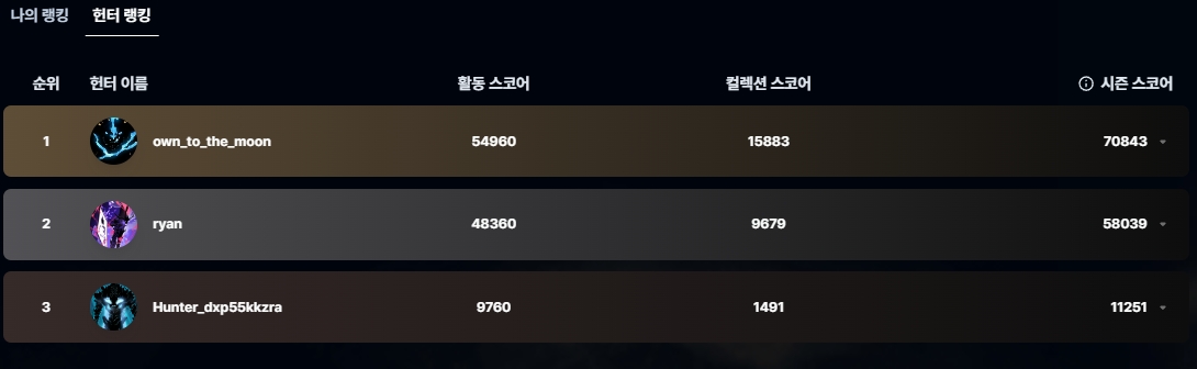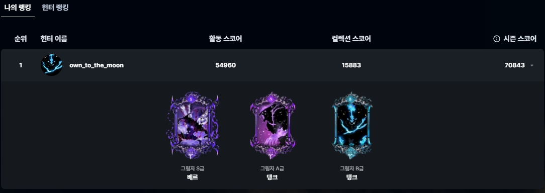 Especially, if users possess Shadow Legion cards (B-rank, A-rank, S-rank), they can check these cards within the "My Ranking" tab. Additionally, in the "Hunter Ranking" tab, users can view scores and rankings of other users, and by clicking on other users, they can also see the list of digital collectibles they own.